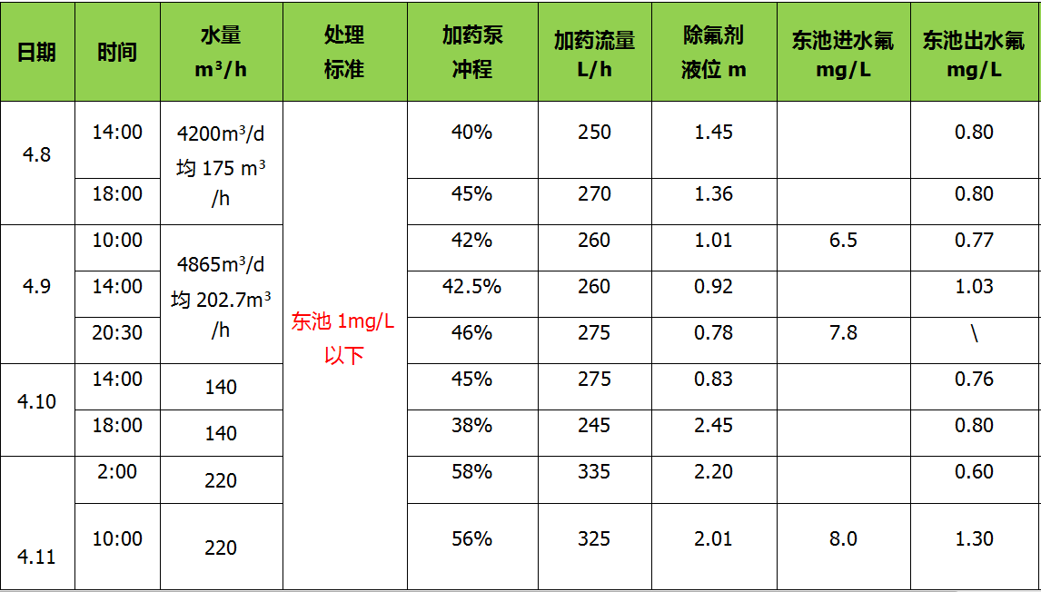 山東環瑞生態科技有限公司為多家企業解決了出水氟含量過高的問題,如山東某上市煤化工有限公司,按照客戶要求分別按照氟化物≦3mg/L或1mg/L進行除氟,通過在東池(SBR處理后)和西池調整除氟劑投加量,將廢水氟化物降至客戶標準。
