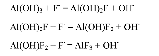 鋁鹽混凝法是去除水中氟離子的常用方法之一,其中堿式氯化鋁的鋁離子與水中氫氧根反應,生成氫氧化鋁。氫氧化鋁在pH值6-7的范圍,按下列反應,被吸附在氫氧化鋁膠體顆粒上,發生沉淀后去除。
