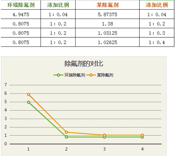 由實驗數(shù)據(jù)可知,環(huán)瑞除氟劑按照同等的比例添加,比市面的除氟劑添加量較多的情況除氟效果好。